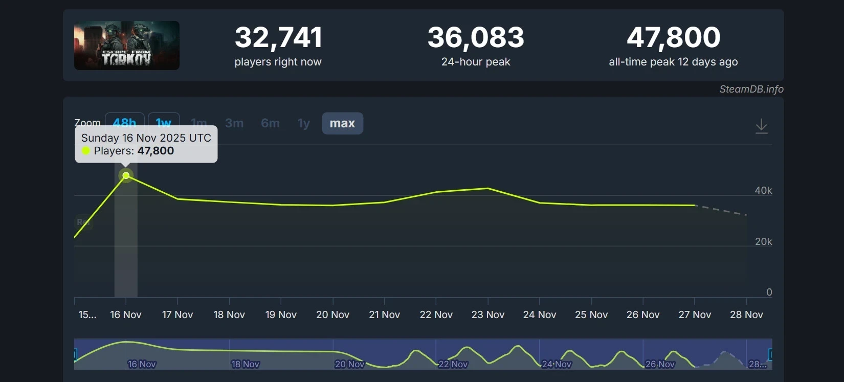 В целом же Escape from Tarkov в Steam продолжает удерживать аудиторию. Например, пиковый онлайн за последние 24 часа превысил 36 тысяч человек. Пик пойти достиг отметки в 48 тысяч геймеров и пришёлся на следующий день после выхода из раннего доступа.