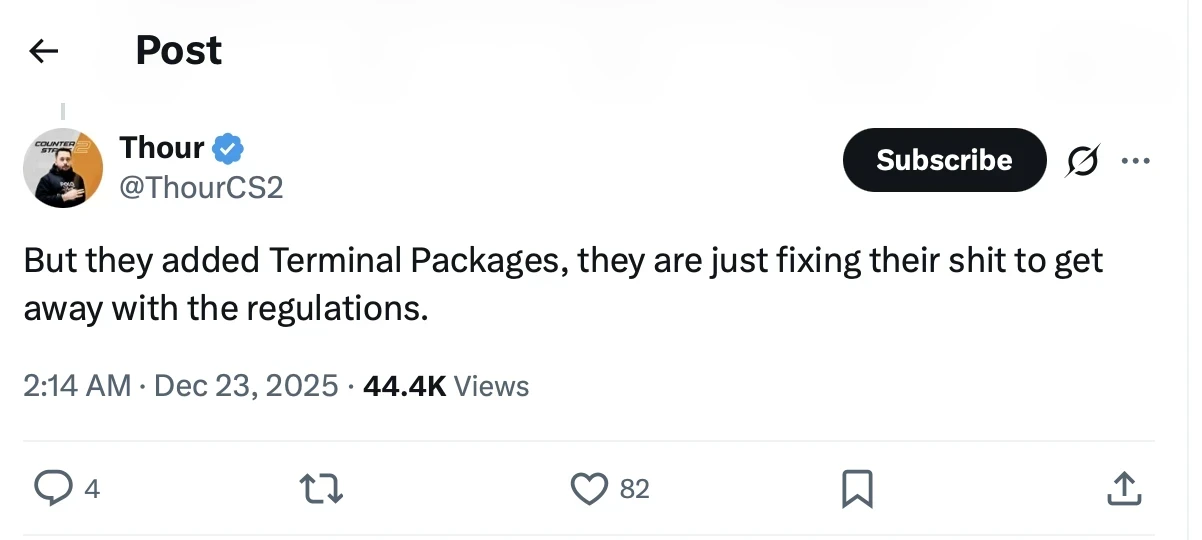Thour уверен, что главной причиной таких изменений является давление регуляторов и жалобы сообщества на то, что CS2 превратилась в казино.