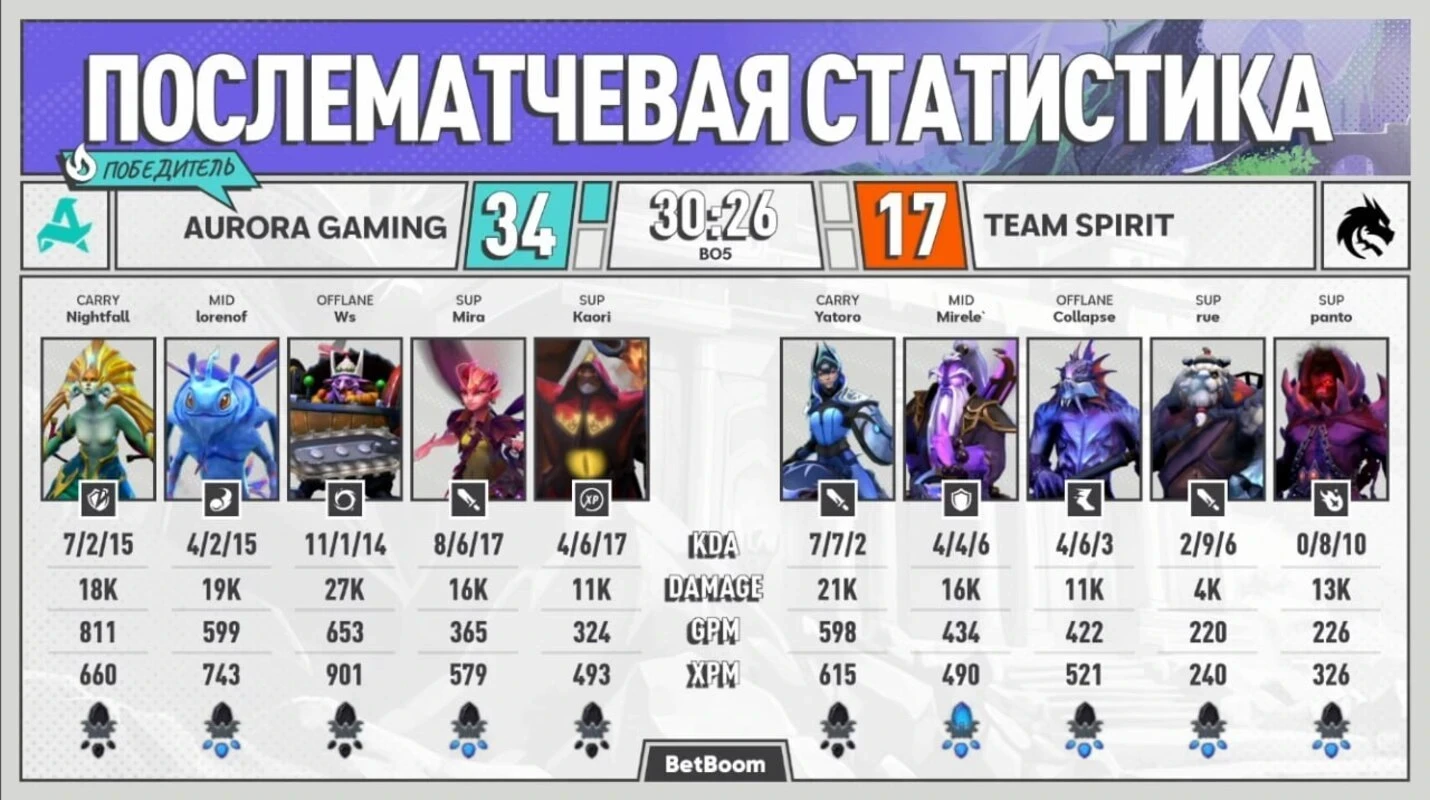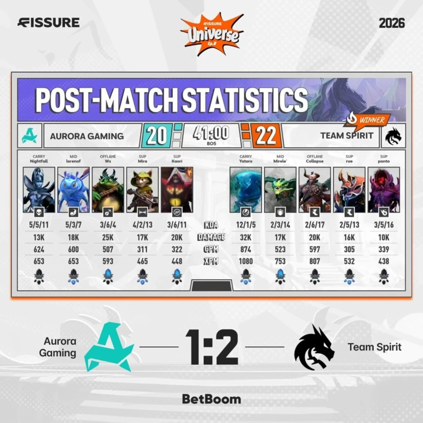 Решающая битва турнира FISSURE Universe: Episode 8 обернулась настоящей катастрофой для Team Spirit. На пятой карте Aurora Gaming продемонстрировала безупречную игру, уничтожив соперника со счетом 30:4 всего за 32 минуты.