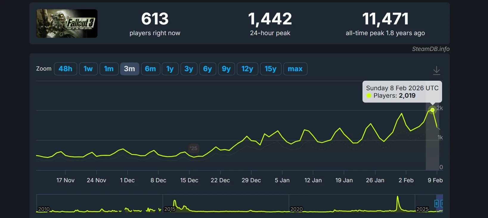 Геймеры не обделяют вниманием и классику, хотя интереса к ней заметно меньше. Так, 1 февраля в оригинальную Fallout зашло почти 1,5 тыс. человек на пике. А Fallout 2 посетило поменьше игроков — чуть более 1,1 тыс. 8 февраля.